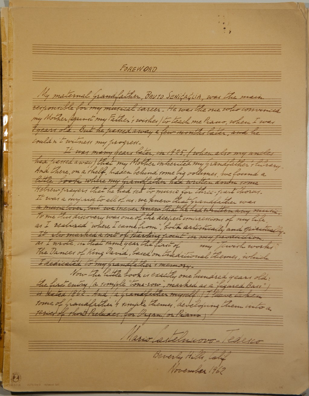 My maternal Grandfather, BRUTO SENIĢAĢLIA, was the man responsible for my musical career. He was the one who convinced my Mother (against my Father's wishes) to teach me Piano, when I was 9 years old. But he passed away a few months later, and he couldn't witness my progress. It was many years later, in 1925, (when also my uncles had passed away) that my Mother inherited my Grandfather's library. And there, on a shelf, hidden behind some big volumes, we found a little book where my Grandfather had written down some Hebrew prayers that he had set to music for three-part Chorus. It was a surprise to all of us: we knew that Grandfather was a music lover, but we never knew that he had written any music. To me, this discovery was one of the deepest impressions of my life, as I realized "where I came from," both artistically and spiritually. It so marked a sort of "starting point" in my production, as I wrote, in that same year the first of my "Jewihs works," The Dances of King David, based on traditional themes, which I dedicated to my Grandfather's memory. Now the little book is exactly one hundred years old: the first entry ( a simple "tone-row," marked as a "figured Bass") is dated 1862. And (a Grandfather myself . .) I have taken some of Grandfather's simple themes, developing them into a series of short Preludes, for Organ (or Piano) Mario Castelnuovo-Tedesco Beverly Hills, Calif. November 1962