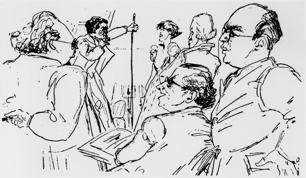 Sketch from a rehearsal of Kurt Weill's The Eternal Road by Benedikt (B.F.) Doblin featuring director Max Reinhardt, playwright Franz Werfel, Weill, and actors Jacob Ben-mi and Lotte Lenya in the background.